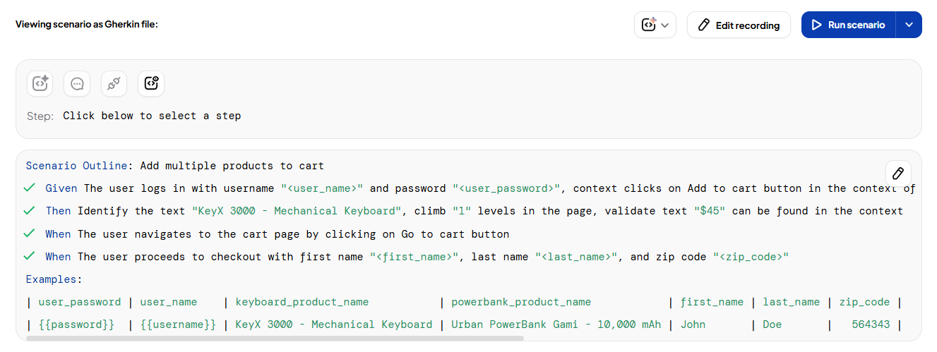 After saving the scenario, the Gherkin file in the Features page will include the test data reference: