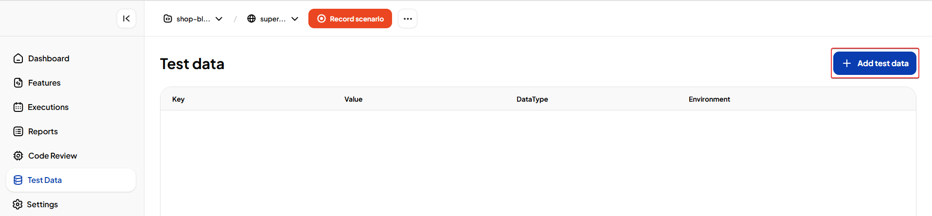 Use the Test Data page to define reusable values before starting a recording session. These values can be referenced across multiple scenarios to maintain consistency, avoid duplication, and support environment-specific customization.