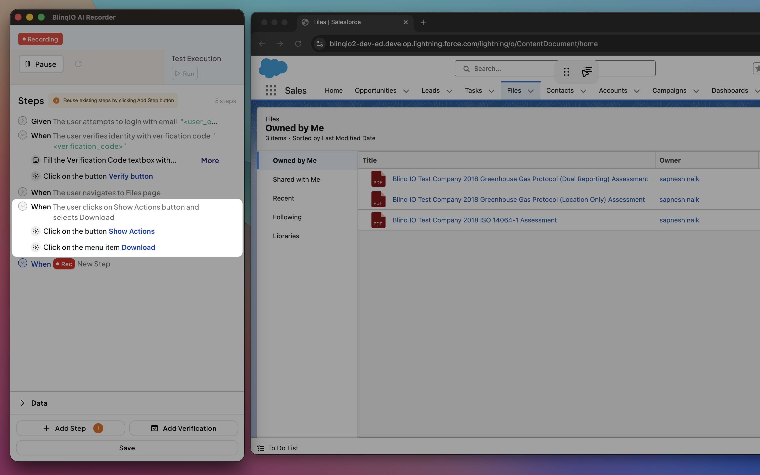 During test execution, the recorder checks whether the file exists in the downloads folder after the trigger action completes.