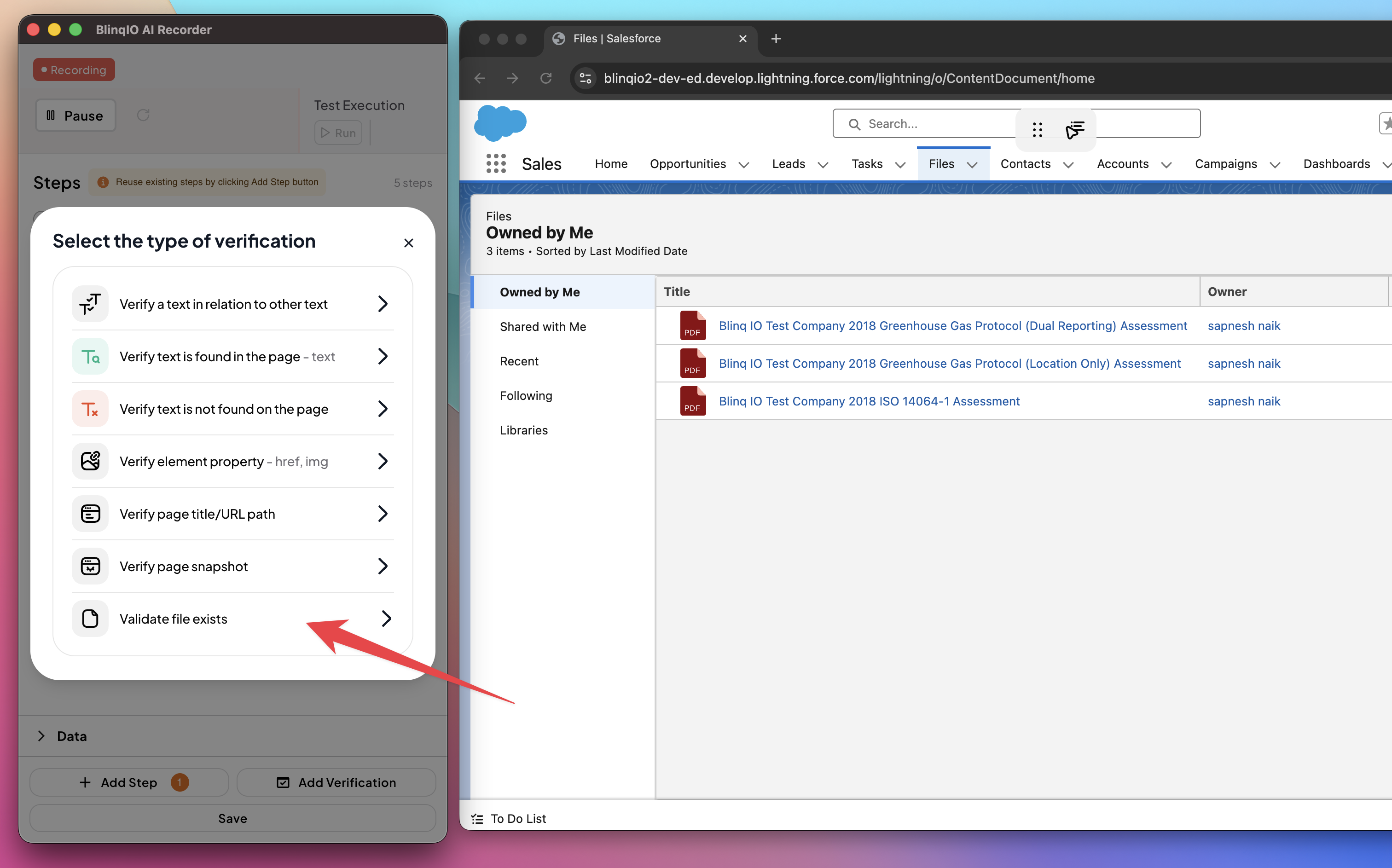Choose Validate file exists from the list of available verifications.