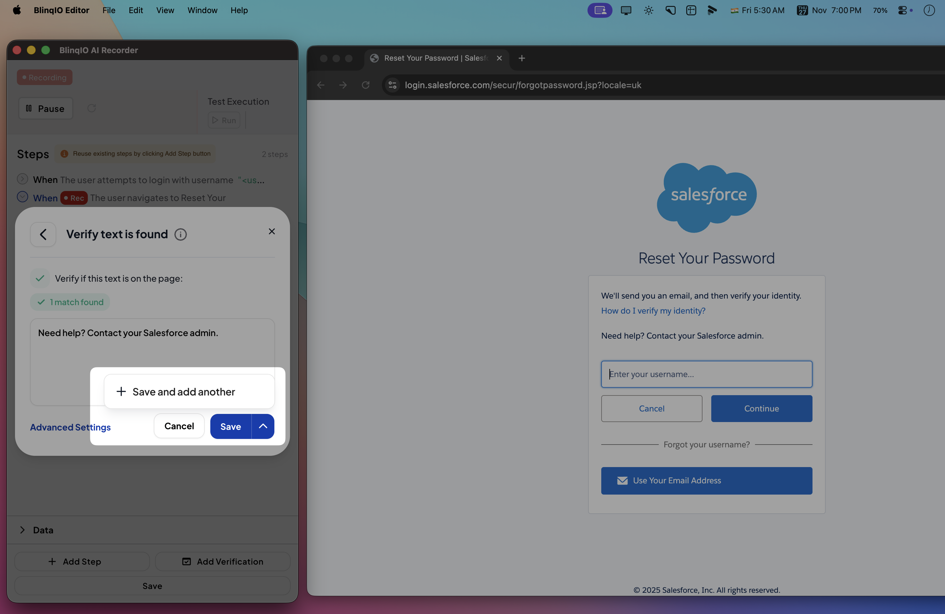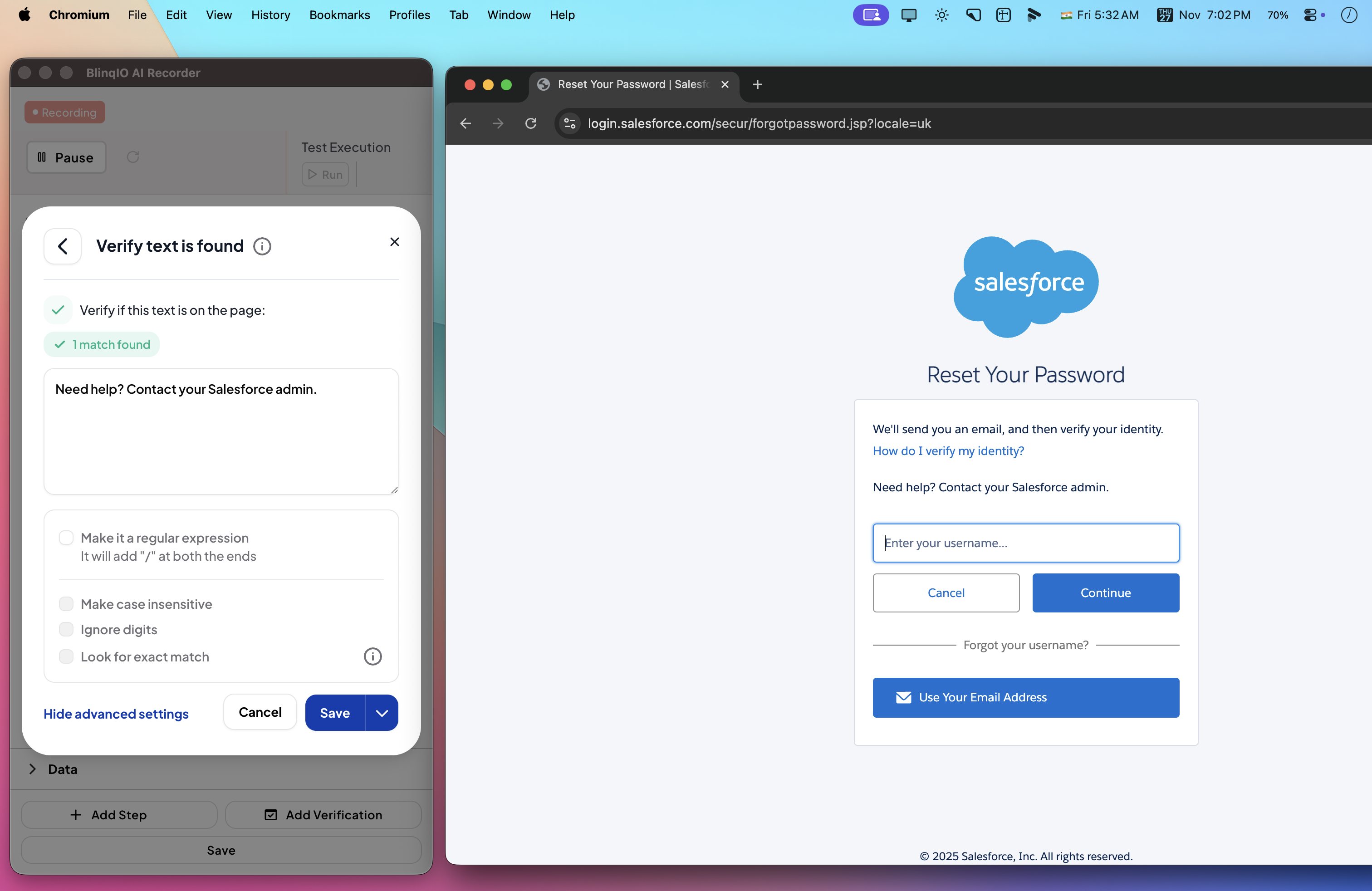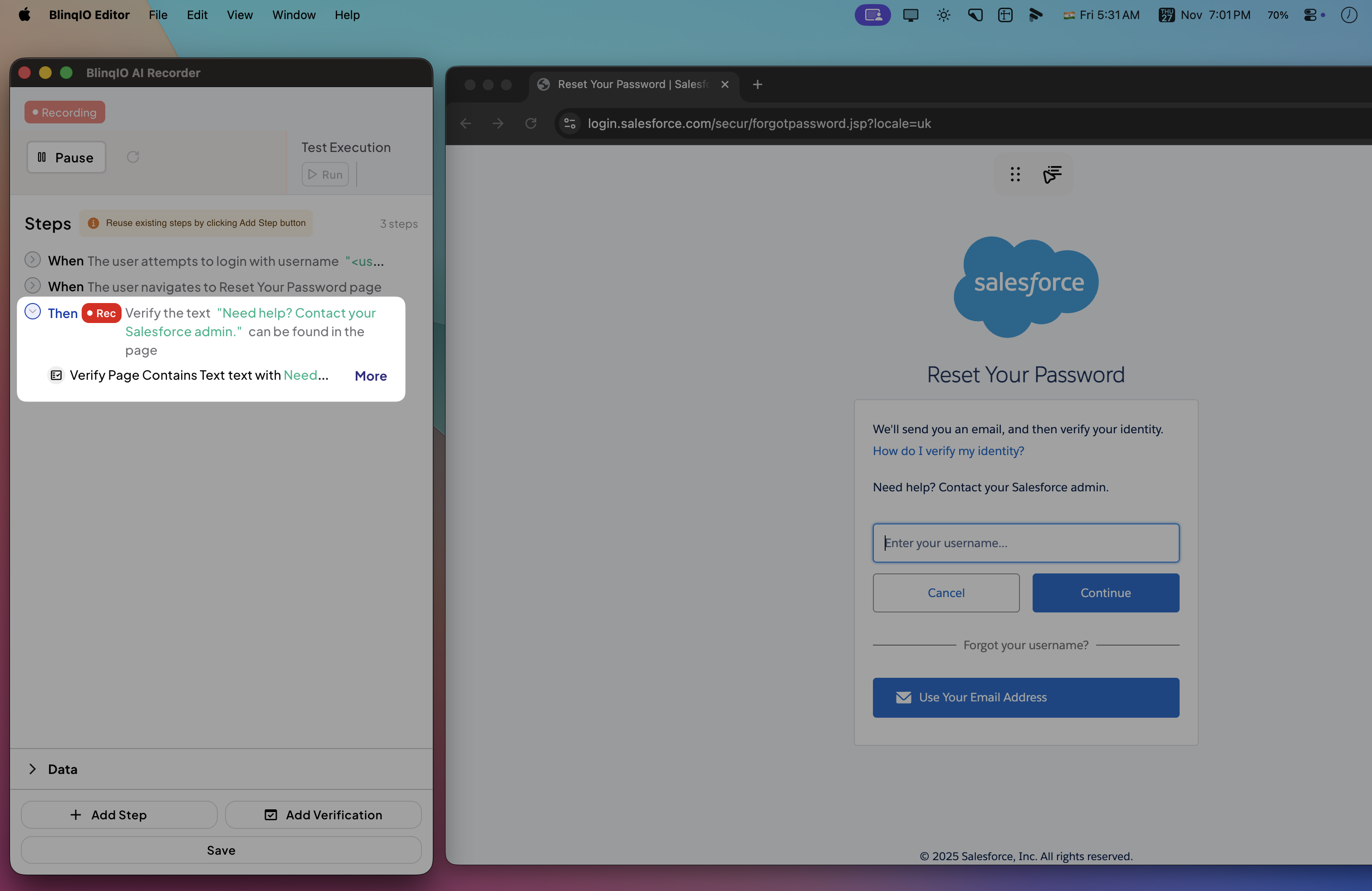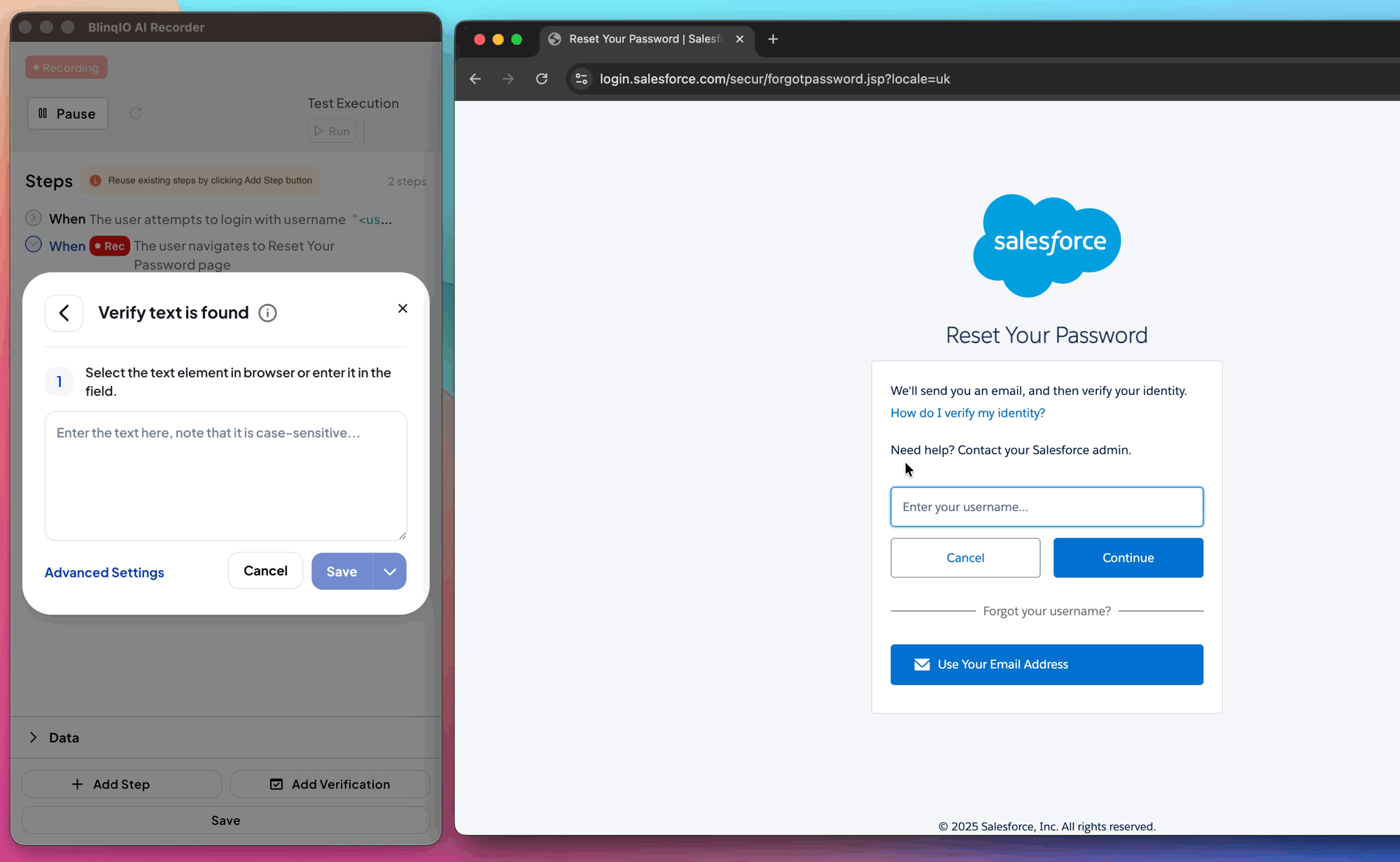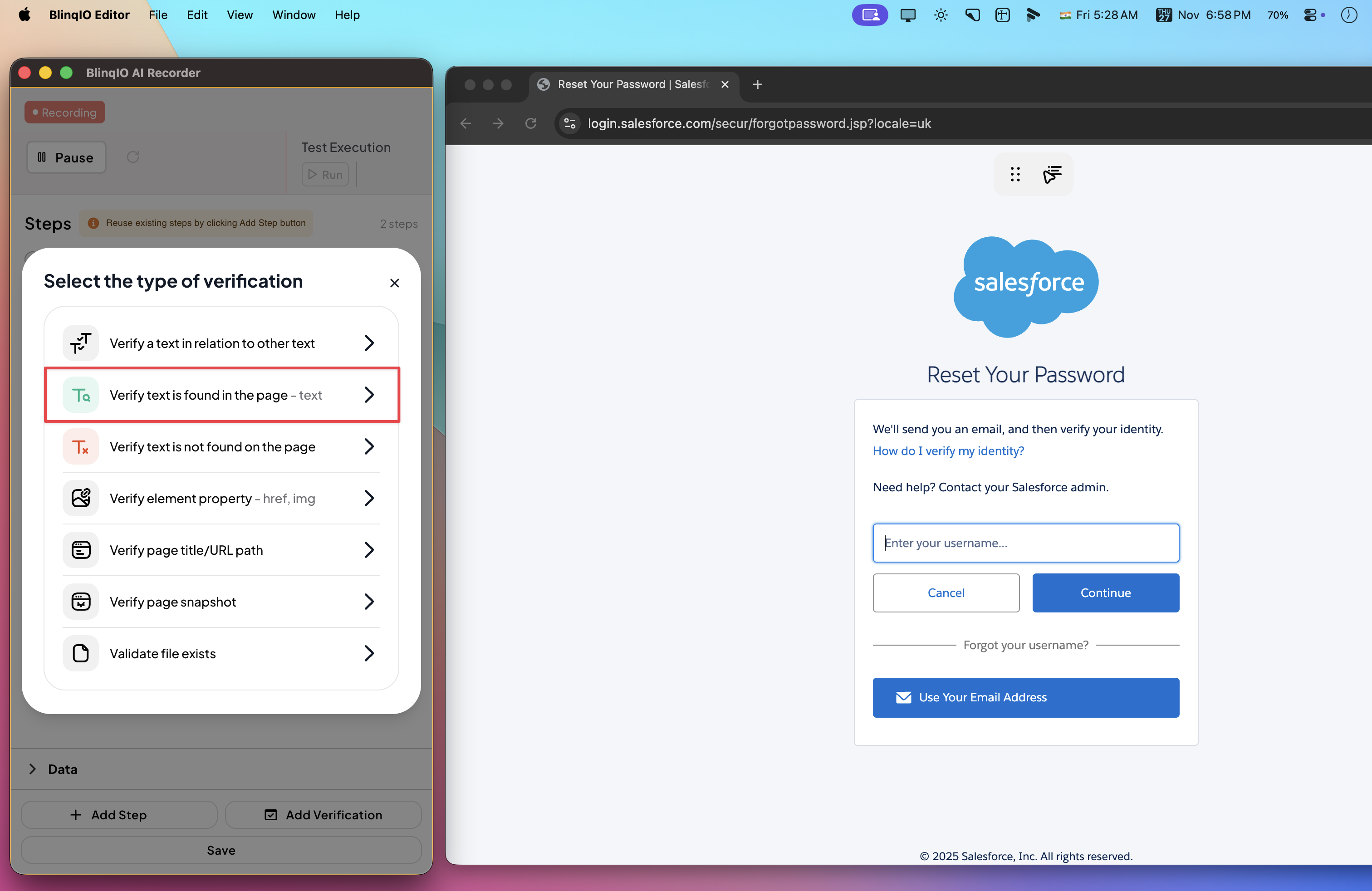 The Verify Text Is Found on the Page step checks if a specific text string appears anywhere in the visible content of the page during test execution. This assertion verifies that users see the expected text, ensuring the page displays the right messages, labels, or headings.
