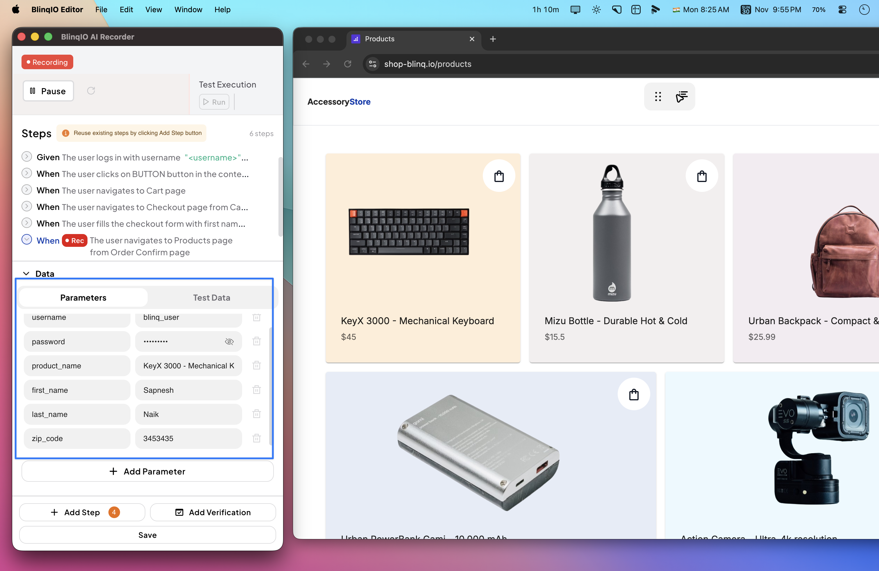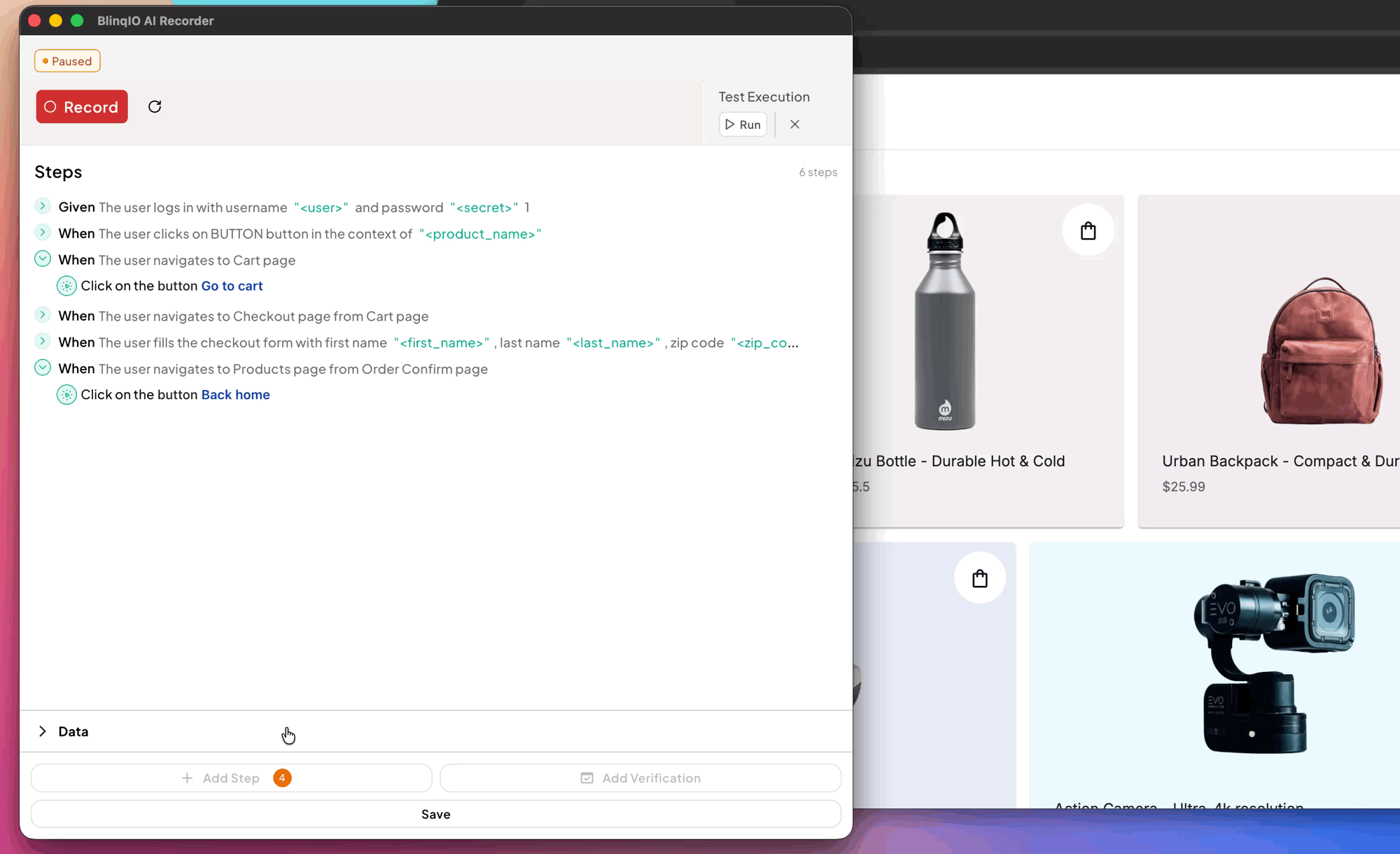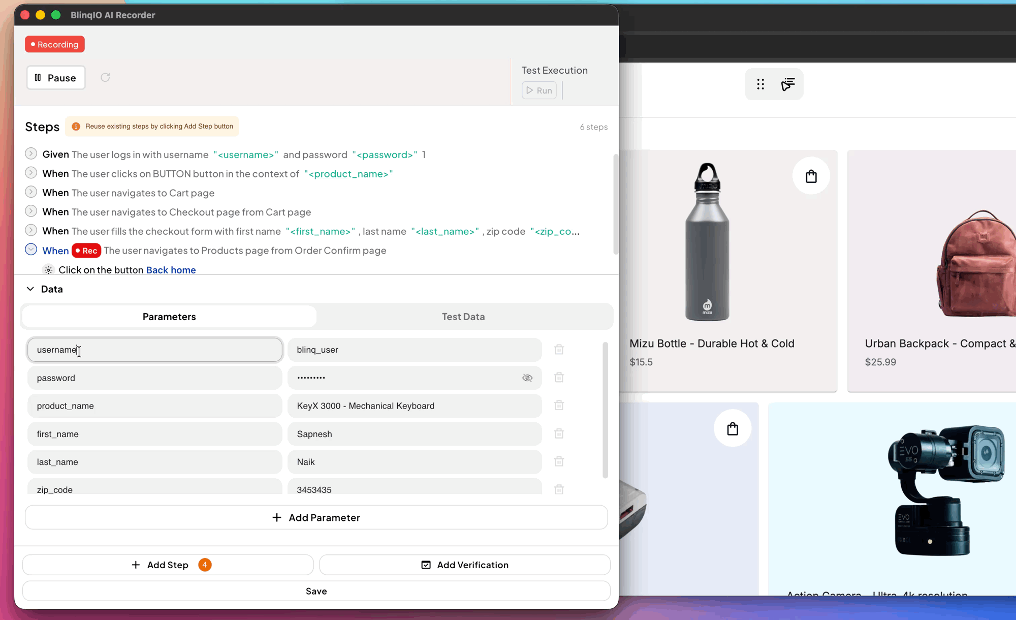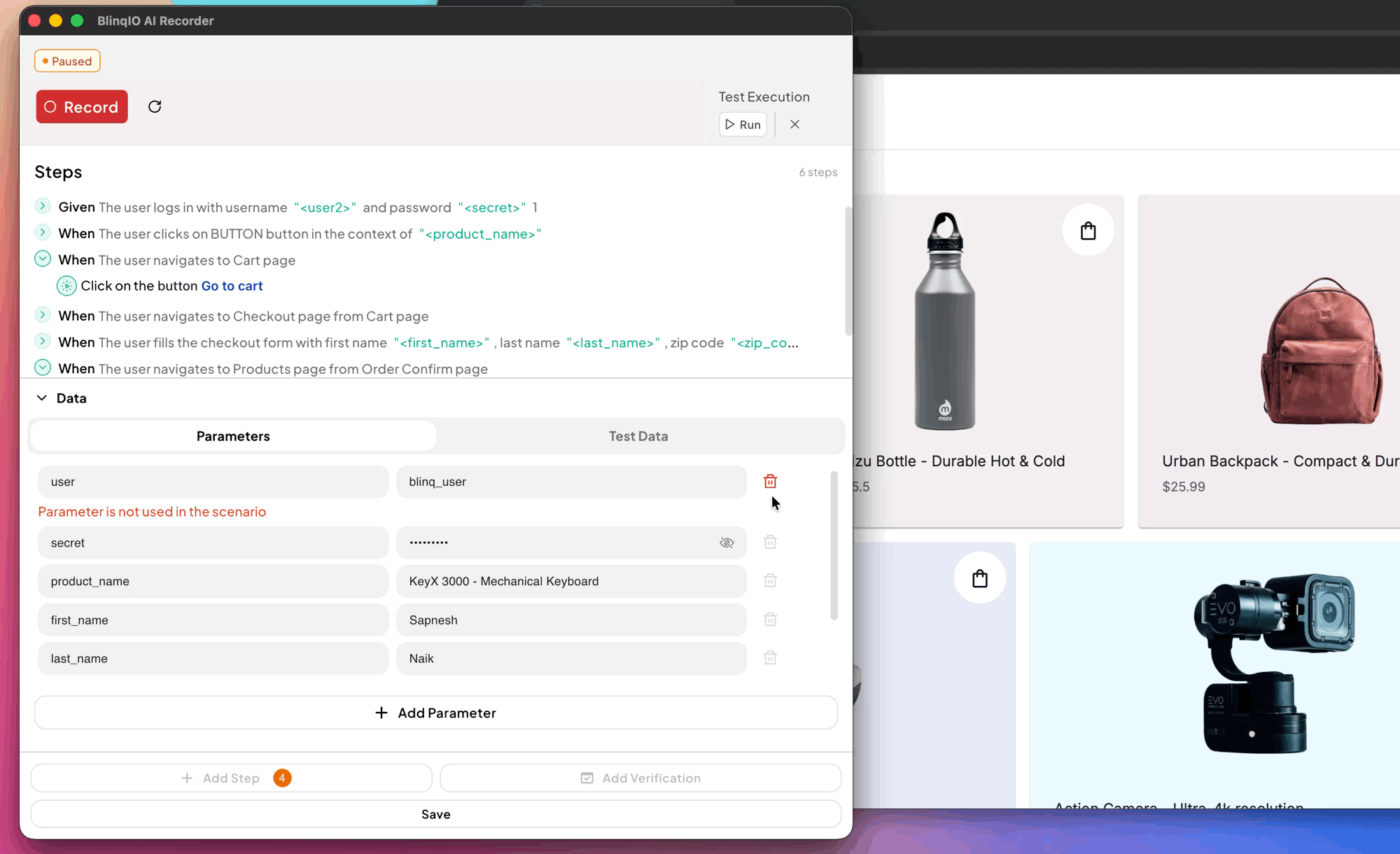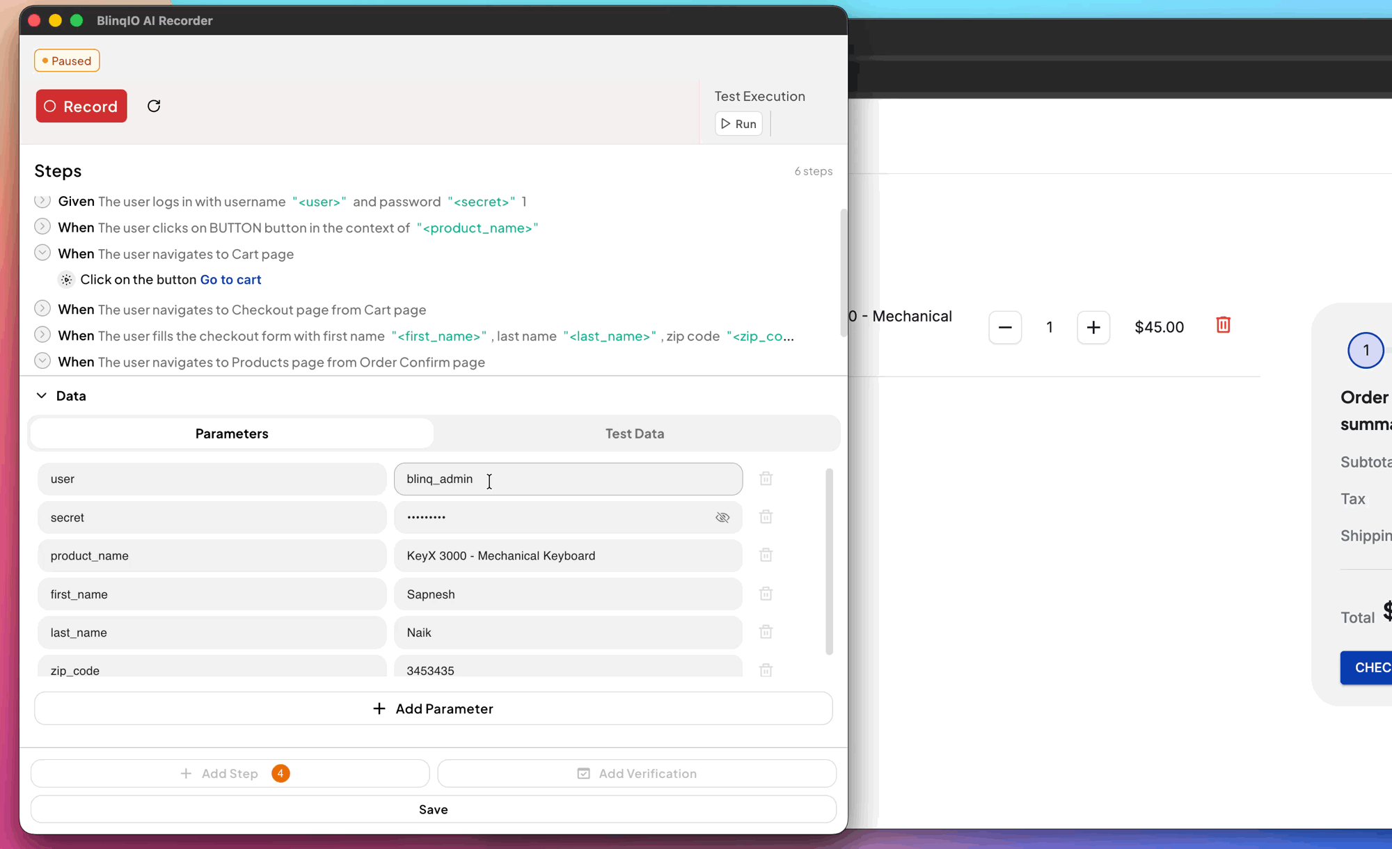 The Recorder automatically detects dynamic test data in your steps and converts them into parameters. Use the expand button to open the BlinqIO Editor and view all test parameters.