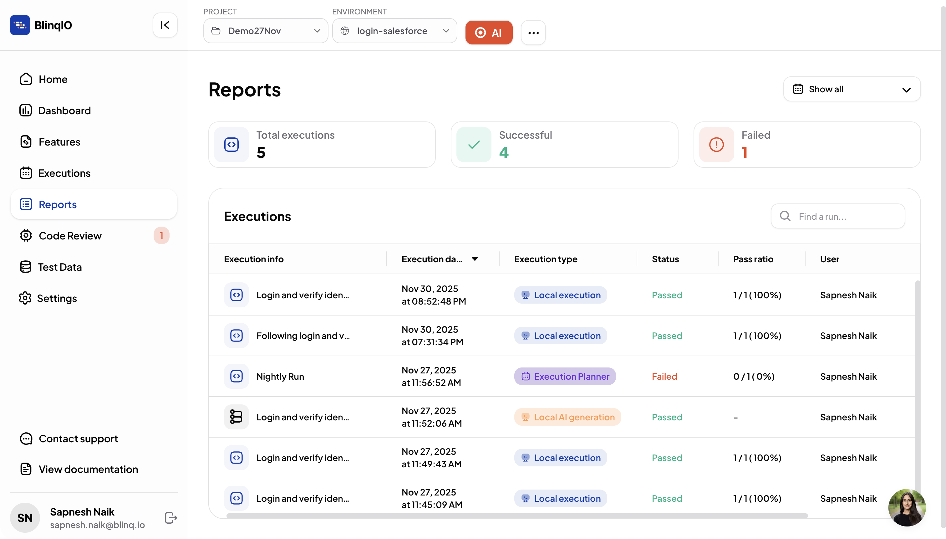 The Reports page provides a centralized view of all test executions within a project. Each execution represents a complete test run that may include multiple scenarios and example rows.