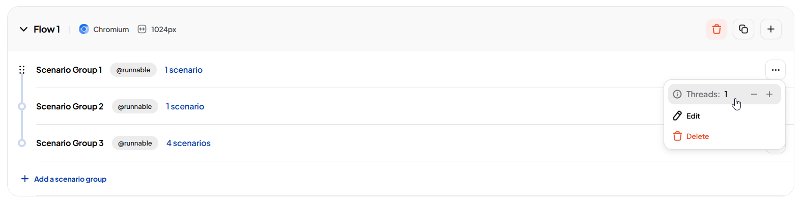 - Scenario groups run sequentially within a flow.