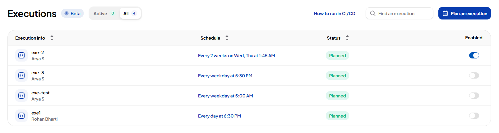 The Executions page lists all scheduled and active runs. From here, you can view details, monitor progress, and manage plans.